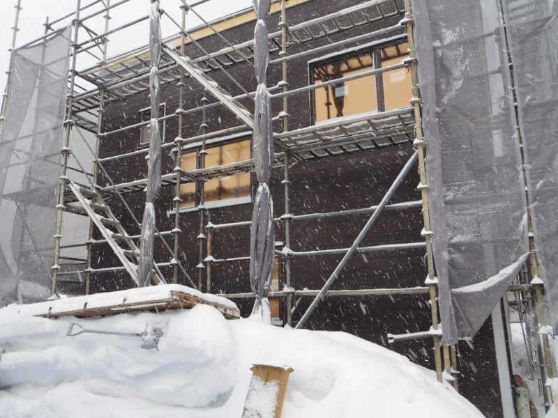 仮設足場に積もった雪や作業スペース確保の為の雪片付けをしてからのサイディング工事となりました。