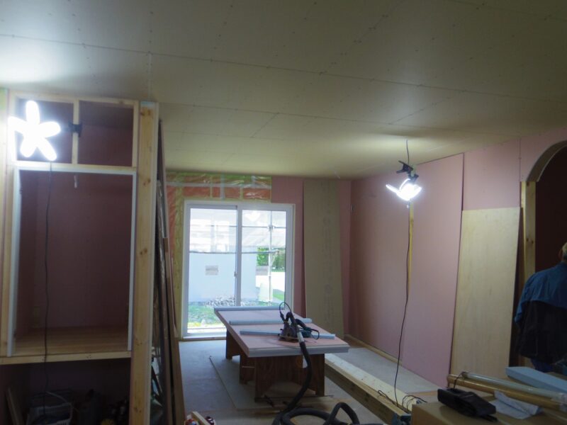 天井や壁に石膏ボードを張っている状況になります。ここまでくると大工さんの工事も終盤に近付いてきます。