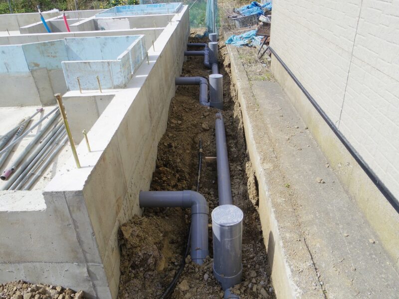 写真の様子は、基礎工事がある程度終了してから工事をする外部の給排水工事の様子です。